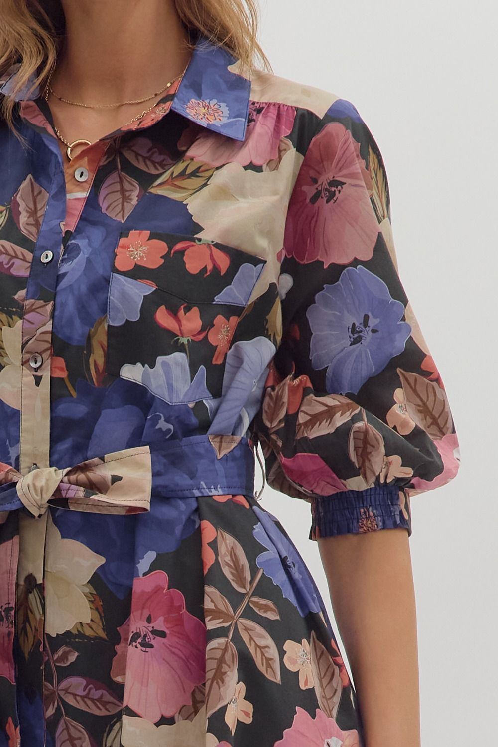 Floral print button down mini dress featuring puff sleeves, front chest pocket, self-tie belt, and inseam side pockets. Lined.