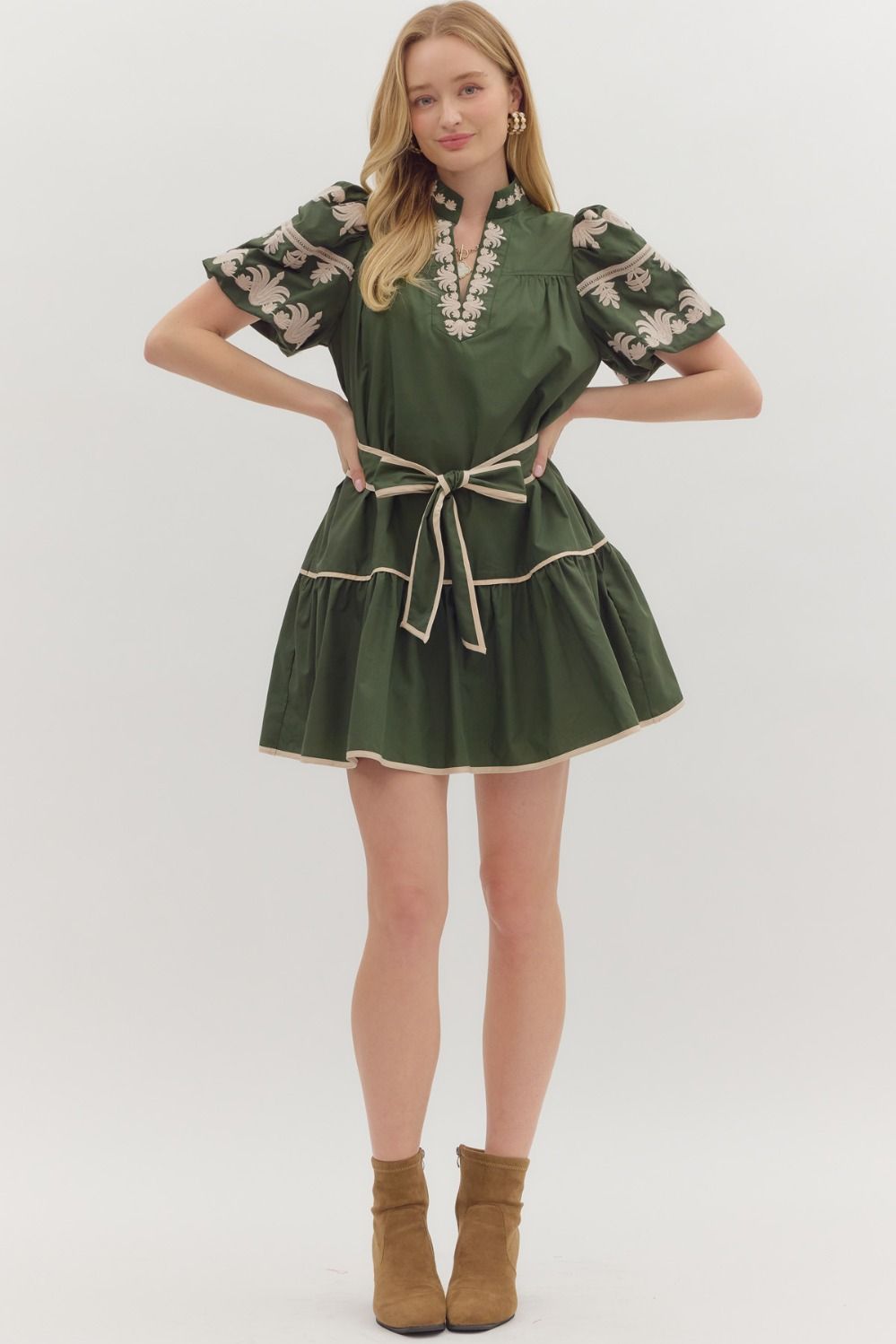 Solid mini dress featuring contrast accents, self-tie belt at waist, floral embroidery along split neckline and short bubble sleeves, and inseam side pockets. Lined. Also available in burgundy.