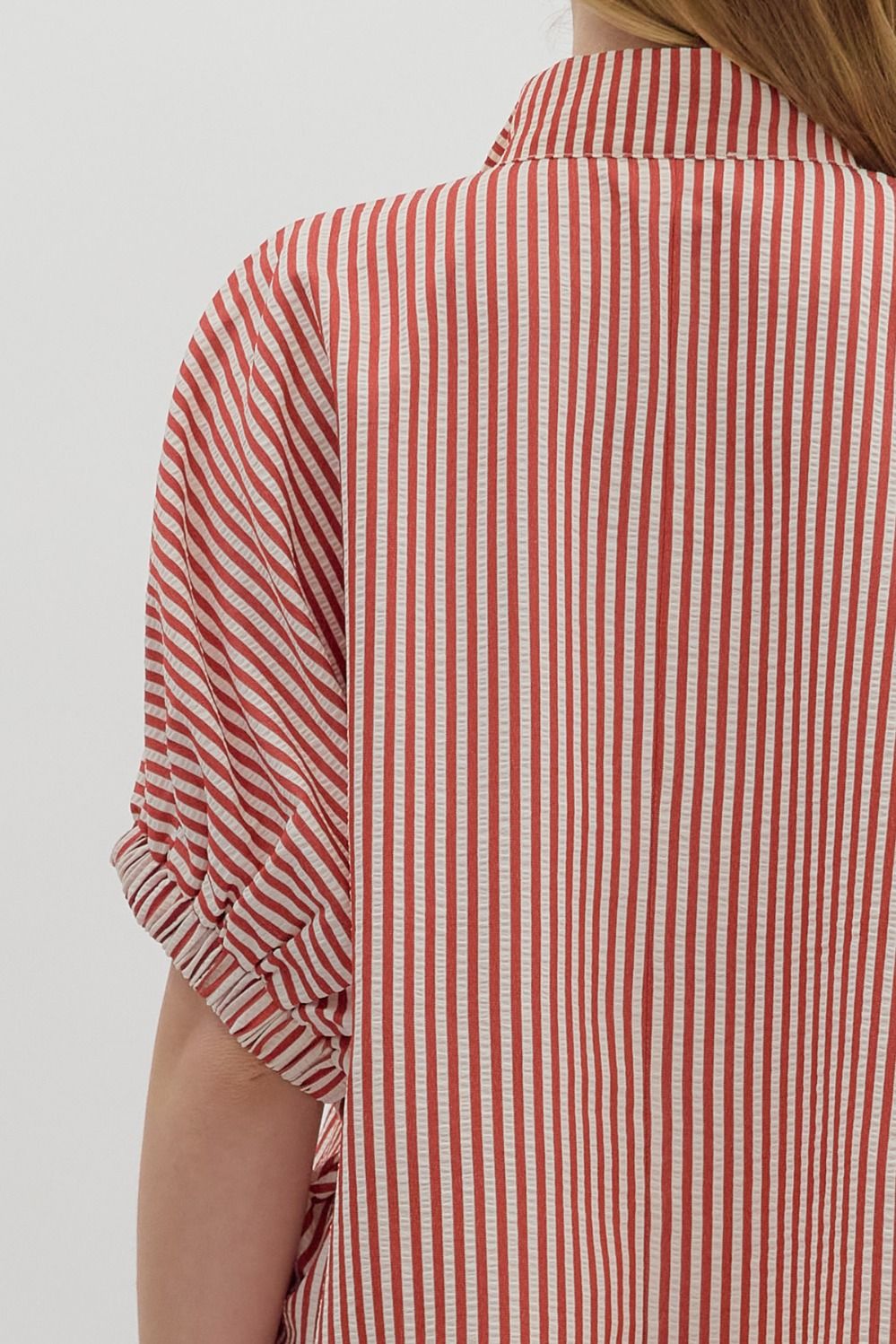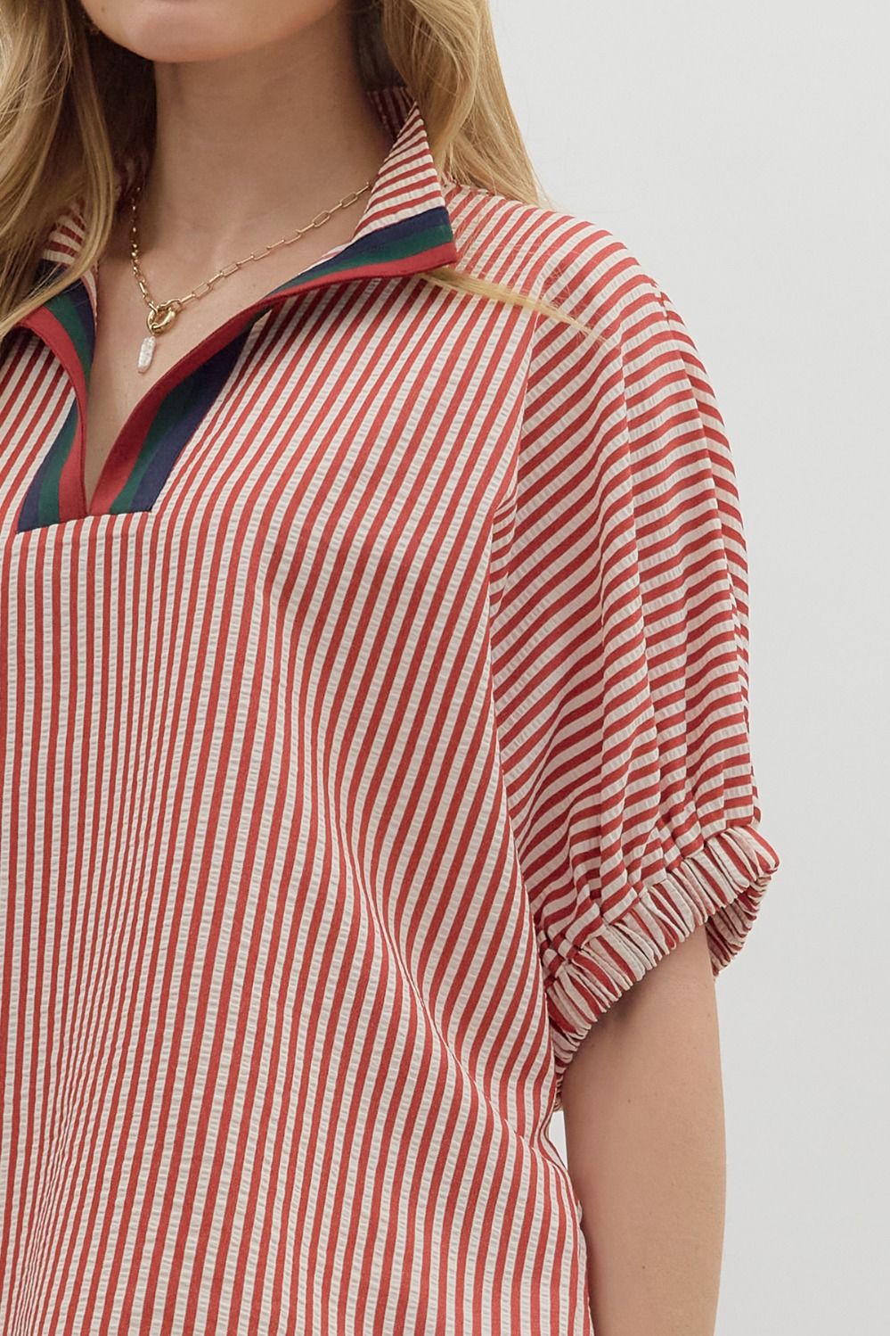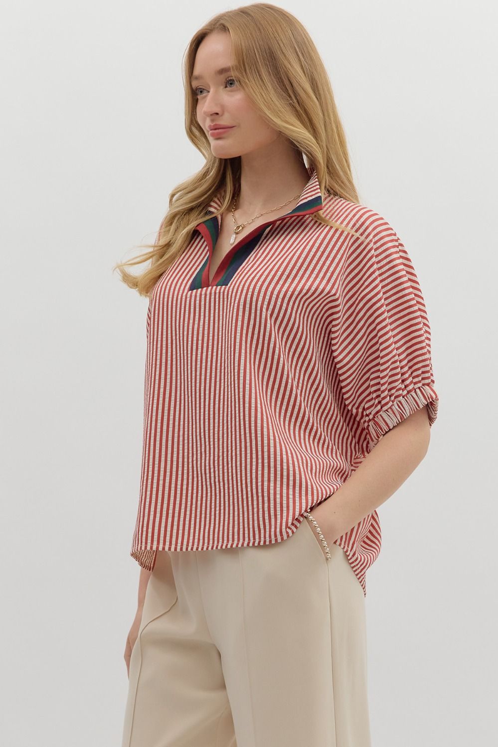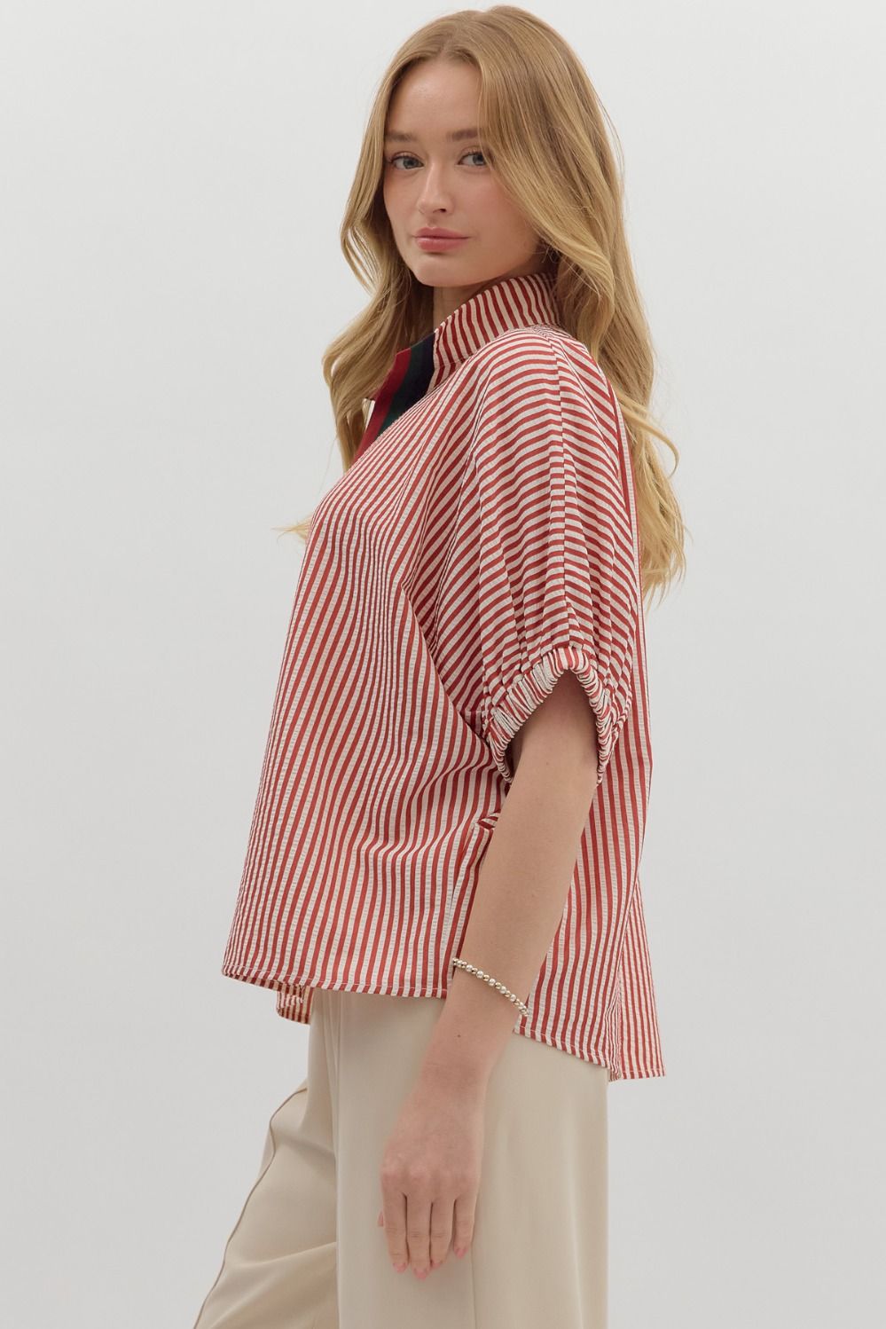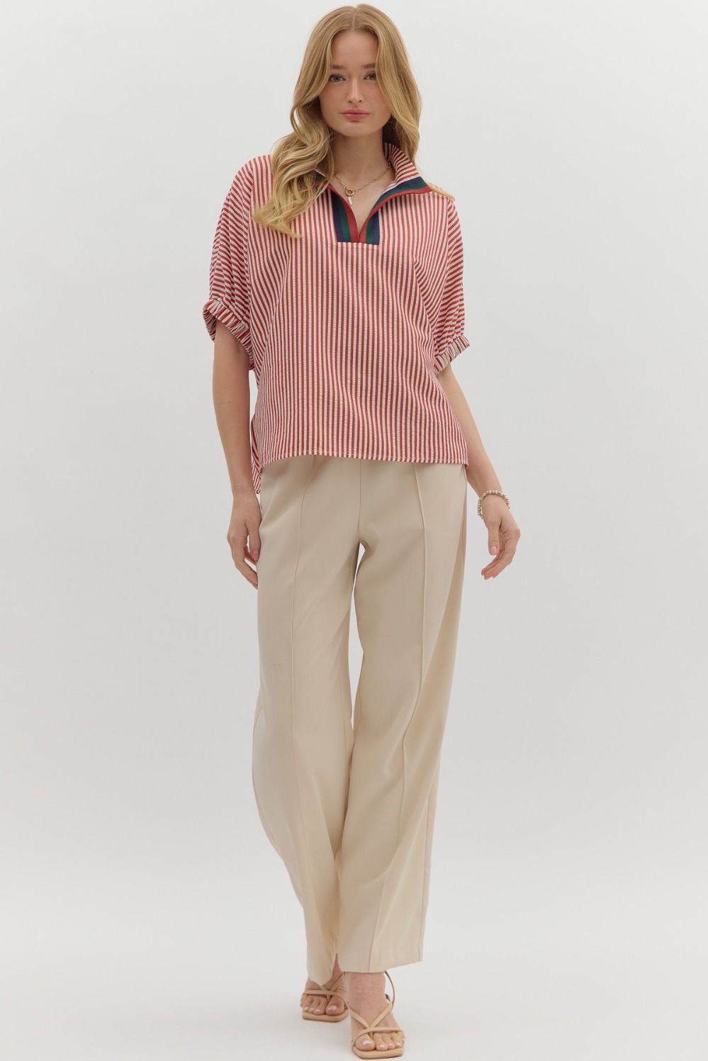 Stripe pattern dolman top featuring accented multicolor rib band split neck and elasticated 1/2 sleeves. Unlined. Also available in olive.