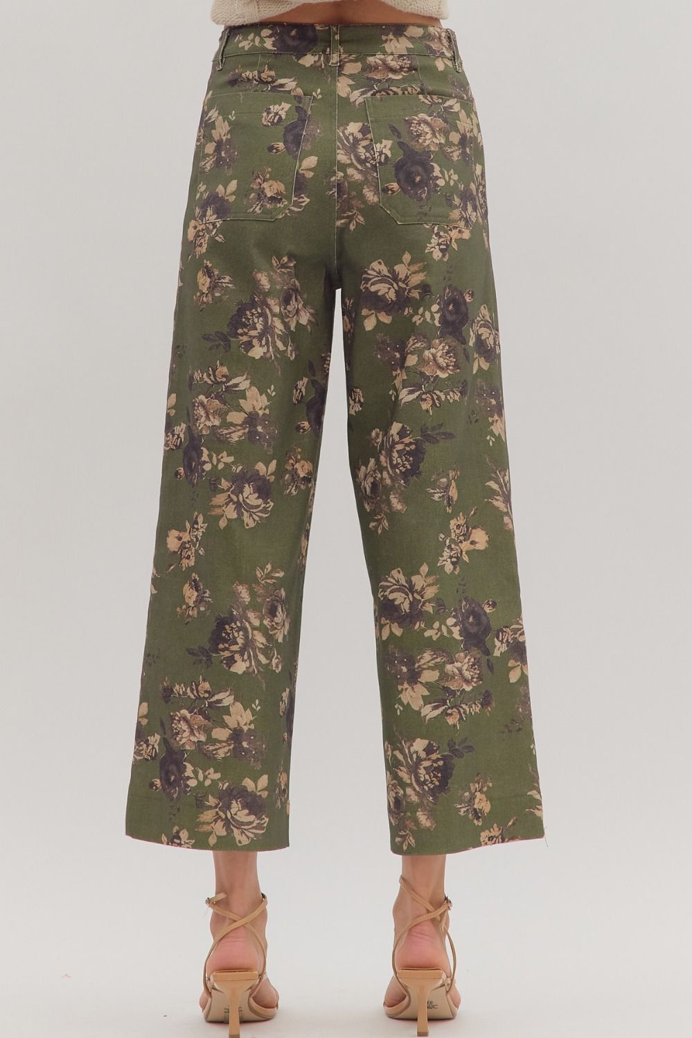 Floral pattern mid-rise ankle-length pants featuring button zip-fly closure at front with patch pockets at front and back. Unlined. Also available in caramel.