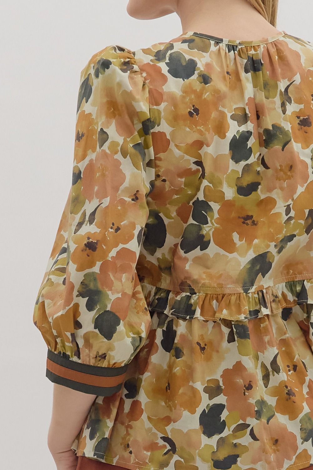 Floral print 3/4 sleeve peplum top featuring ruffle trim along. chest and waist, and pintuck detail and tie closure at front. Unlined.