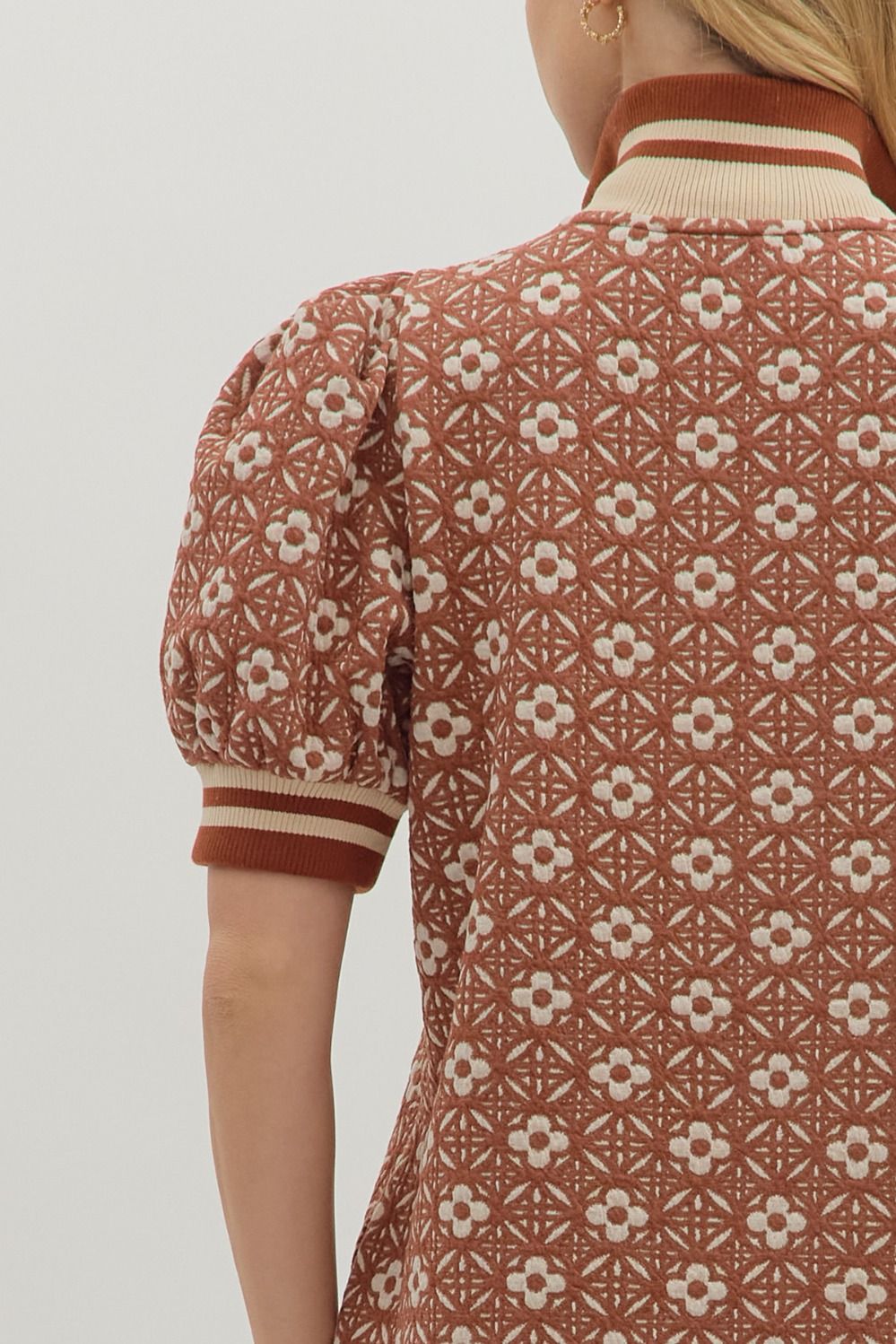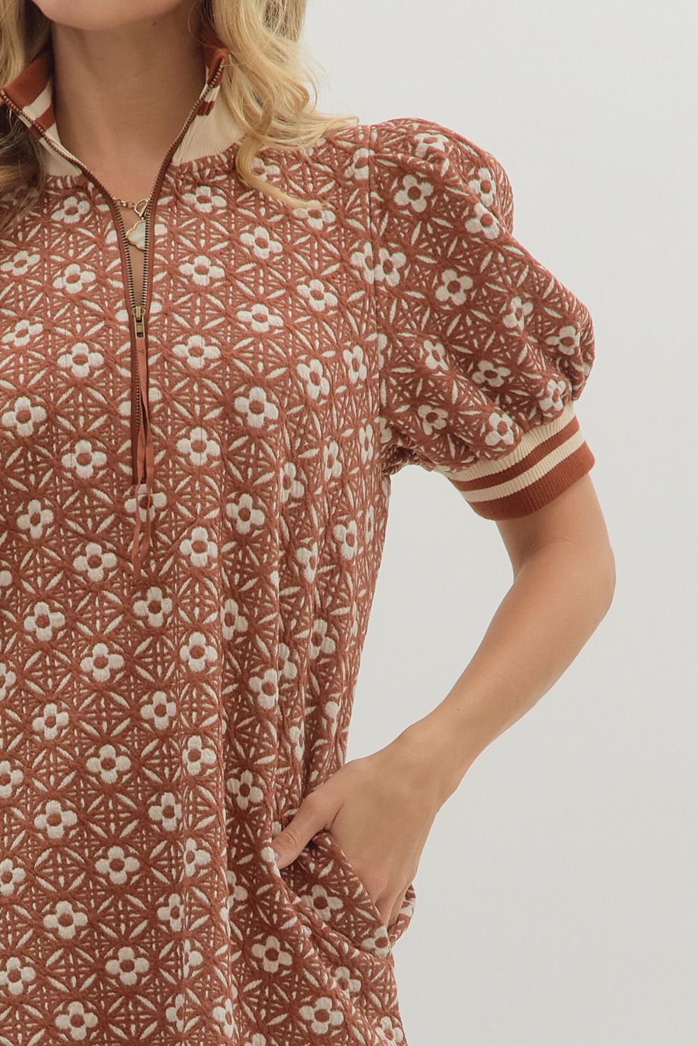 Floral textured mini dress featuring half zip closure at front, short puff sleeves, inseam side pockets, and accented ribbed collar and cuffs. Unlined.