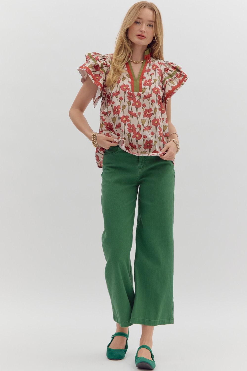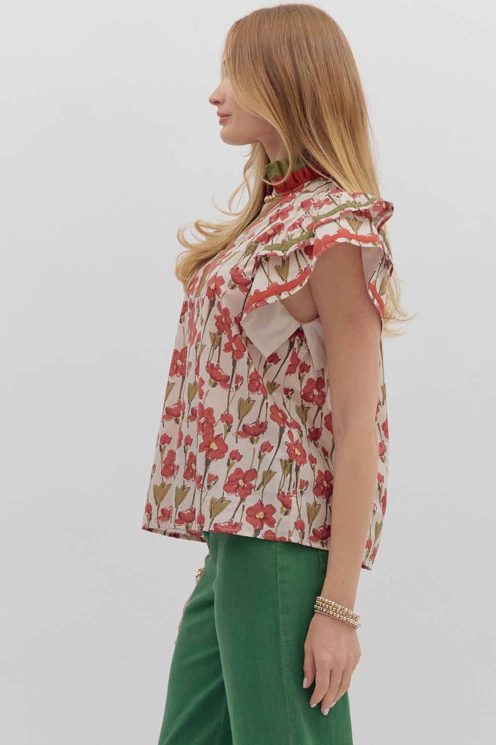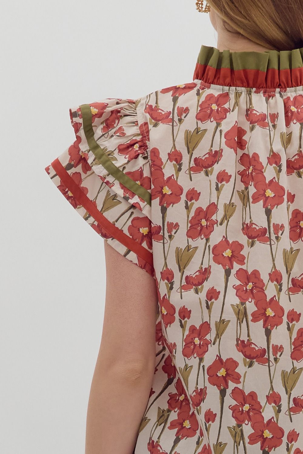 Floral print tiered flutter sleeve pullover top featuring multicolor accented ruffle neck and sleeve finish. Unlined.
