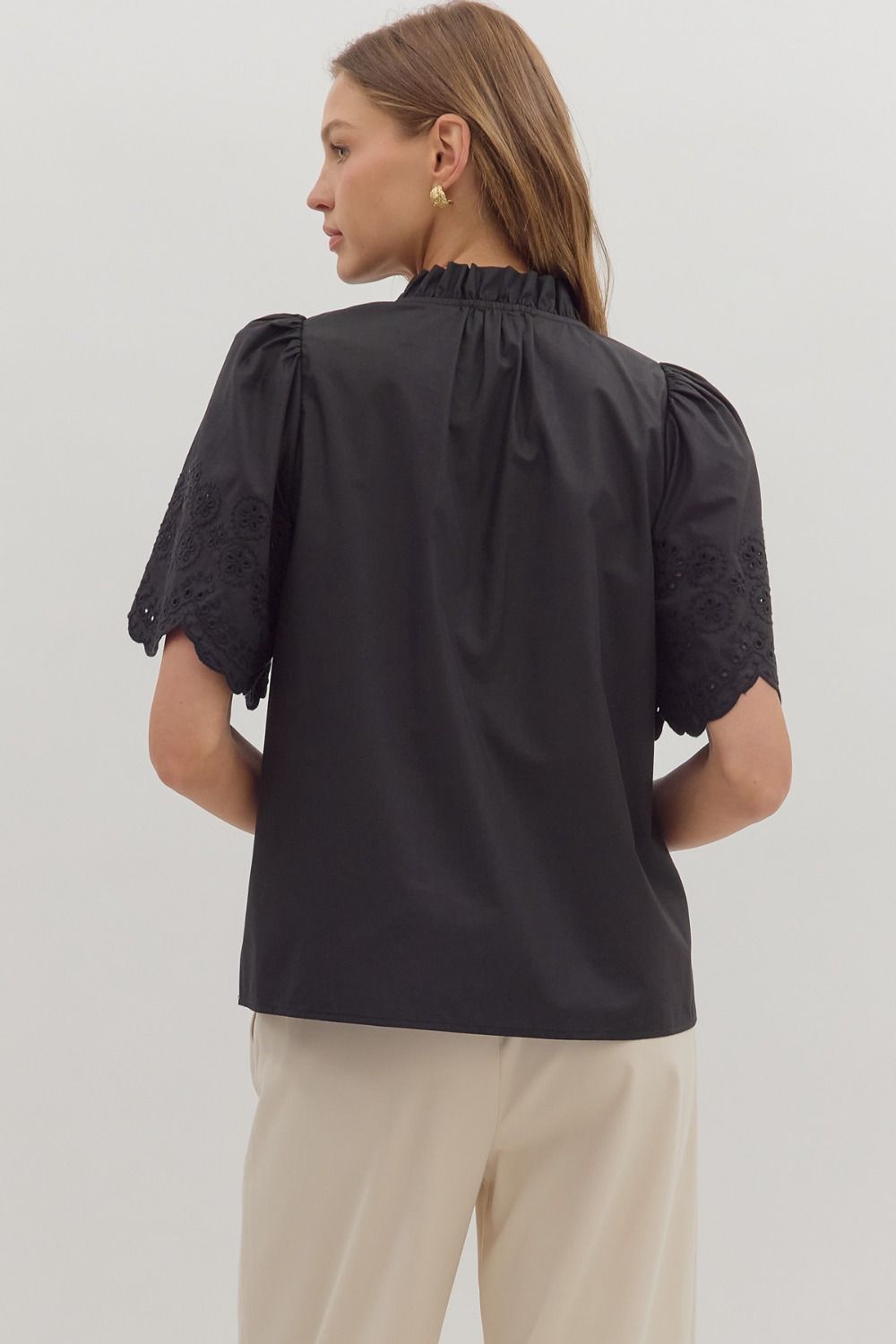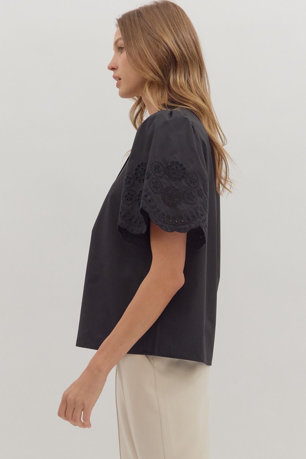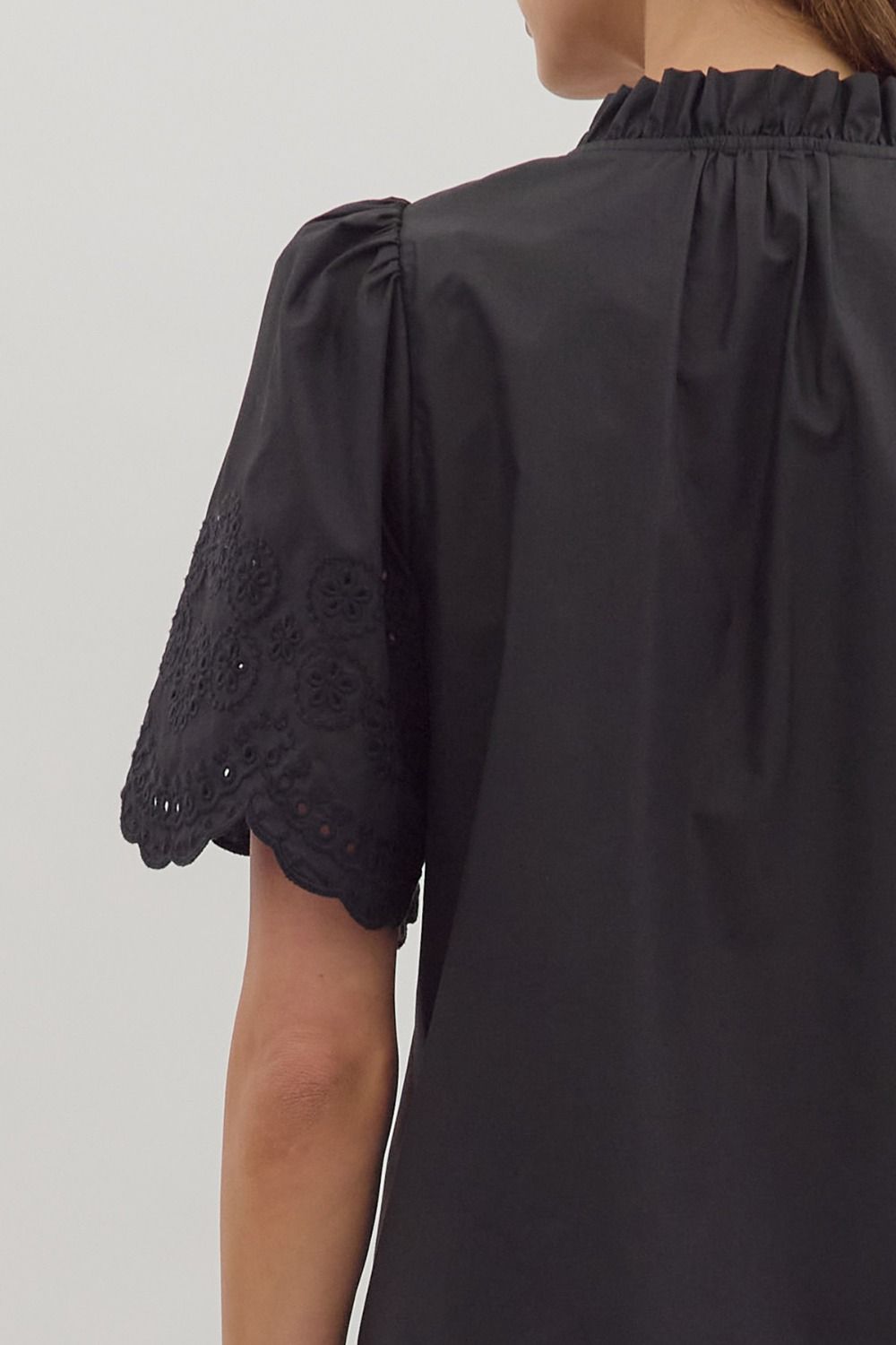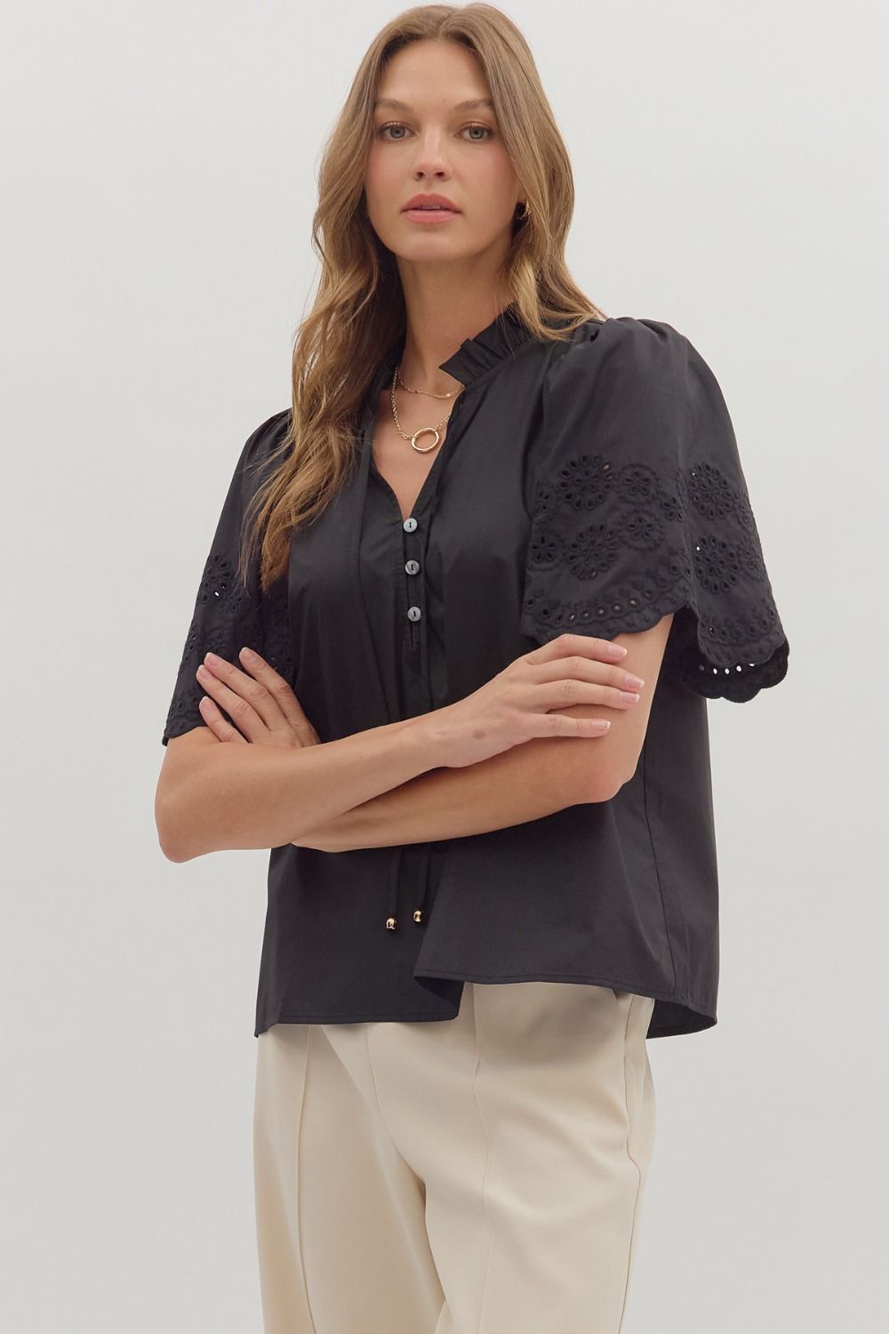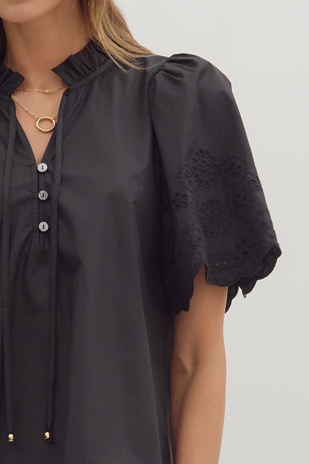 Solid short sleeve top featuring tie detail at front neck, button closure at front, and eyelet embroidery flared sleeves. Unlined.