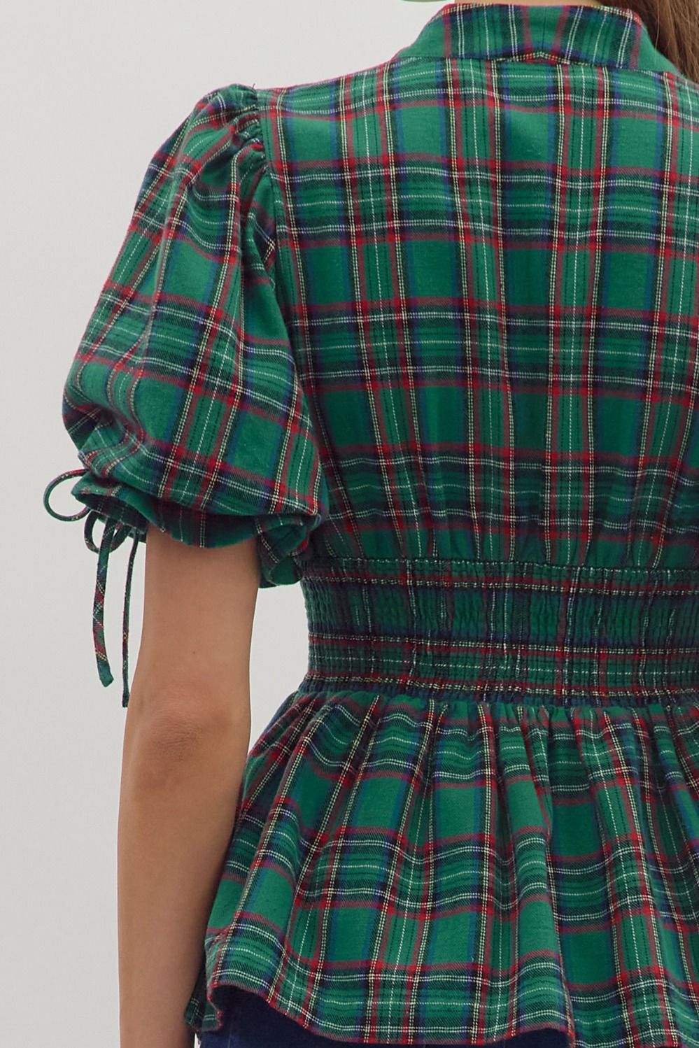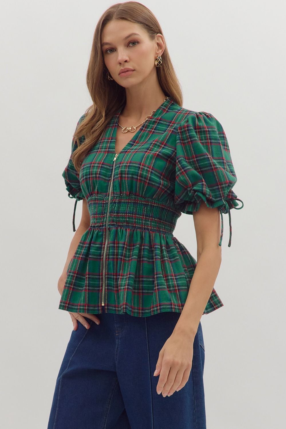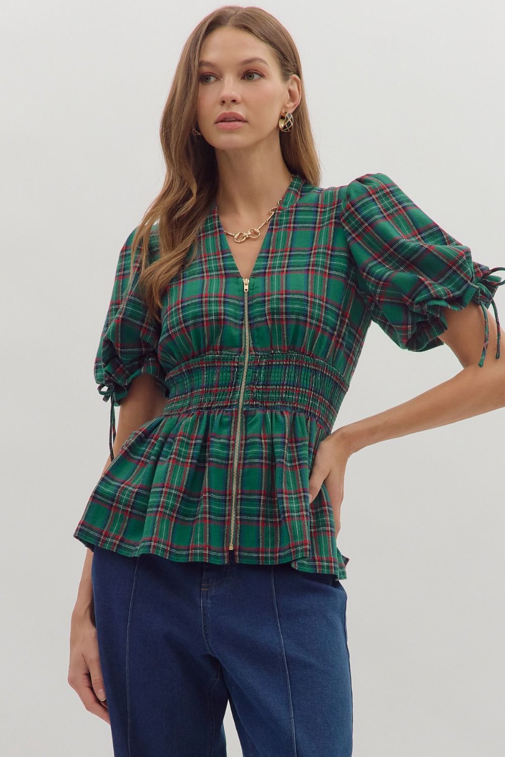 Plaid short puff sleeve top featuring smocked waist and tie accents at sleeves and full zipper closure at front. Unlined. Also available in taupe.