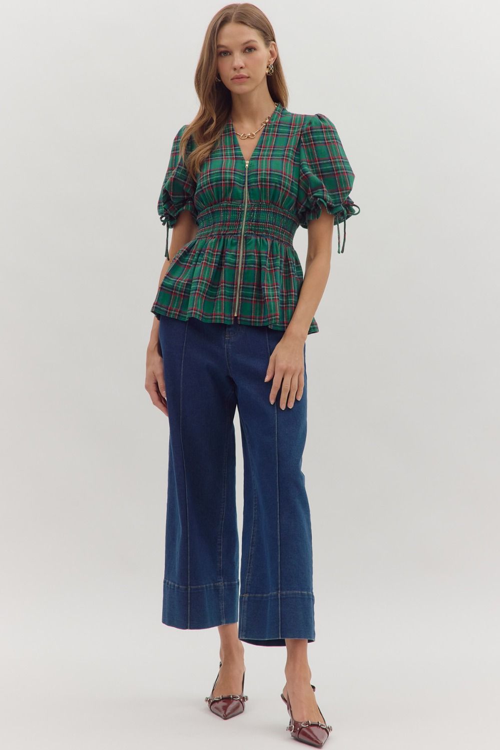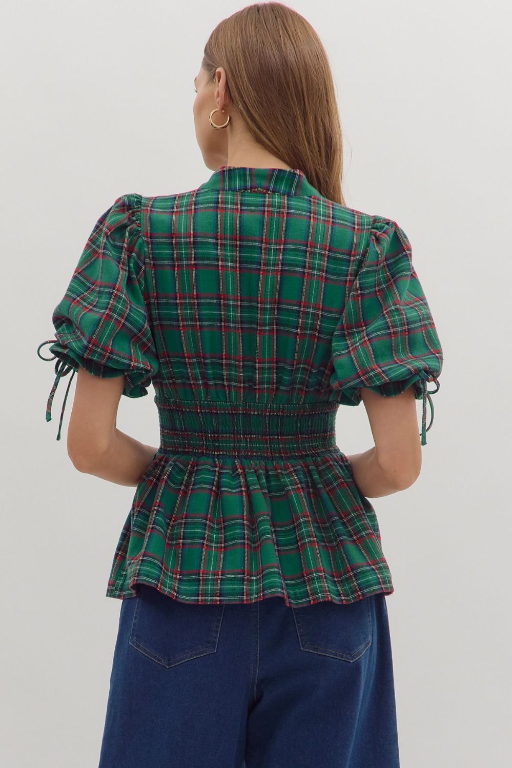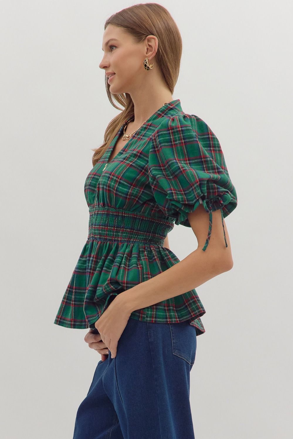 Plaid short puff sleeve top featuring smocked waist and tie accents at sleeves and full zipper closure at front. Unlined. Also available in taupe.