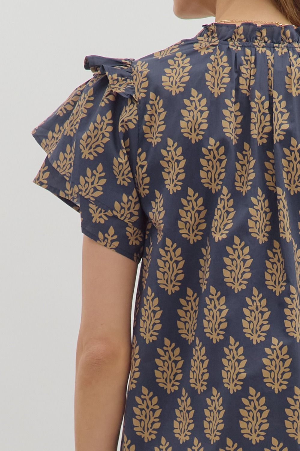 Botanical pattern top featuring tiered short sleeves, split neckline with button and tie closure. Unlined.