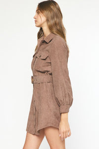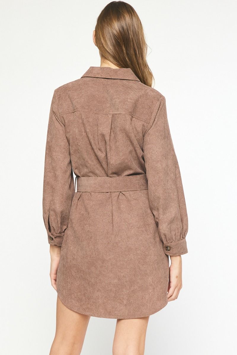 Corduroy collared button up mini dress featuring pockets at bust, long sleeves, rounded hem, and belt detail at waist with belt loops. Unlined.