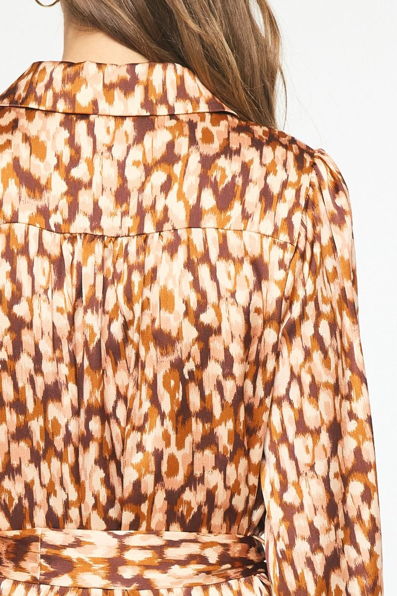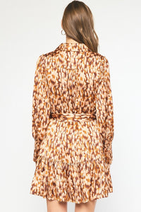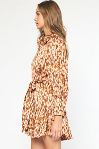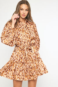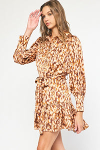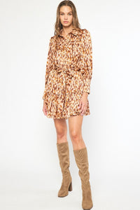 Printed collared button down long sleeve mini dress featuring removable self-tie belt. Lined. Lightweight.