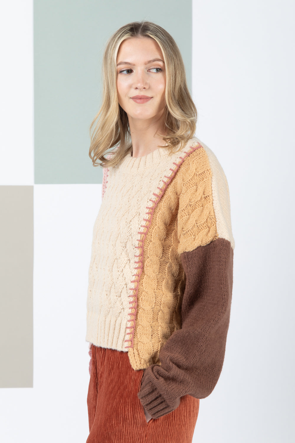 Casual colorblock knit sweater top featuring drop shoulders, blanket stitch detailing, and round neckline.