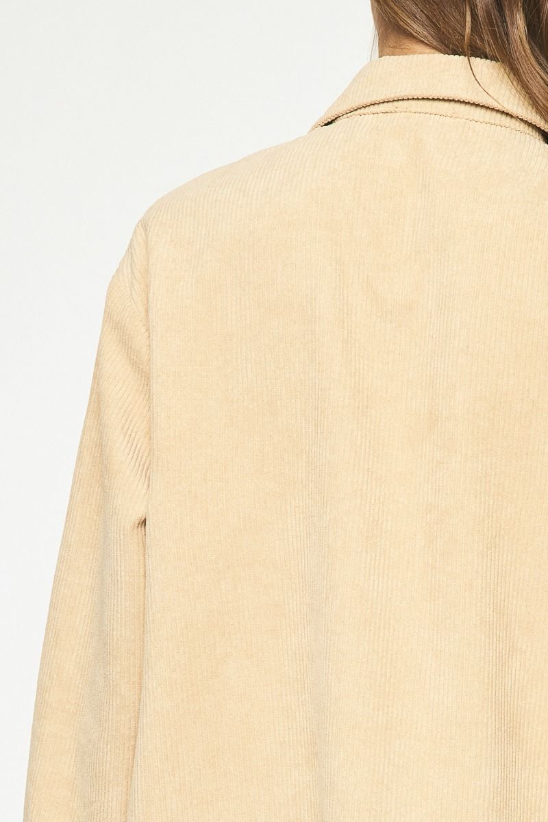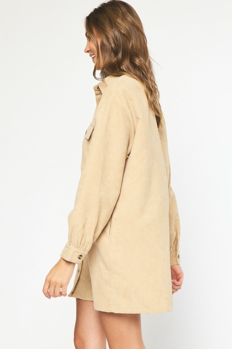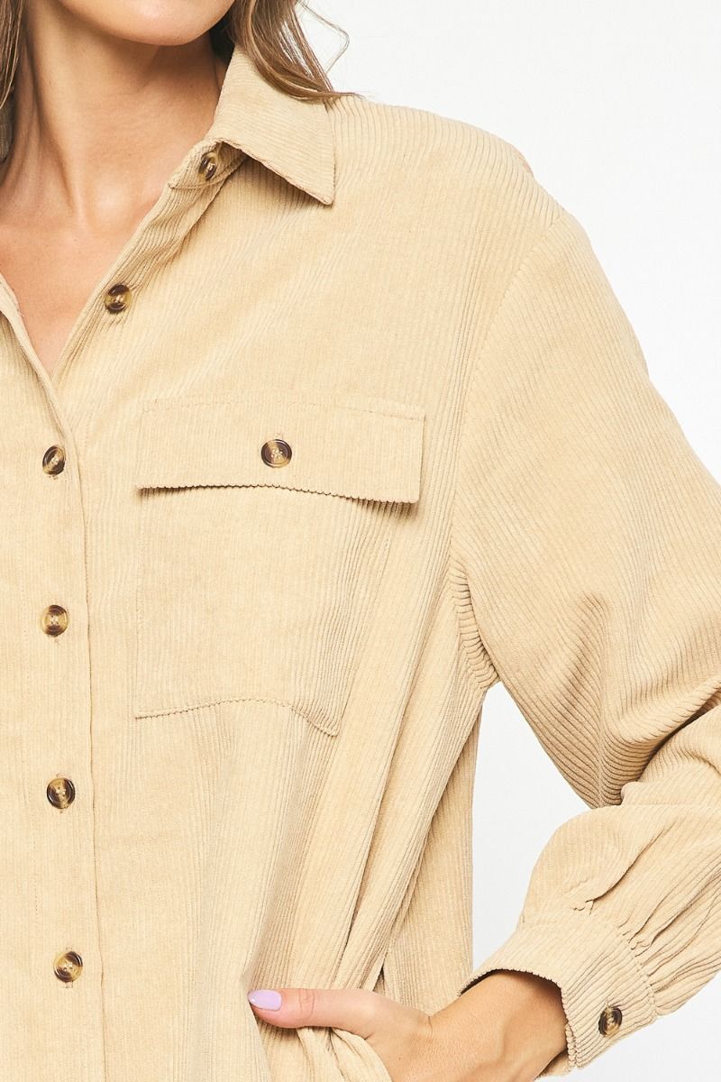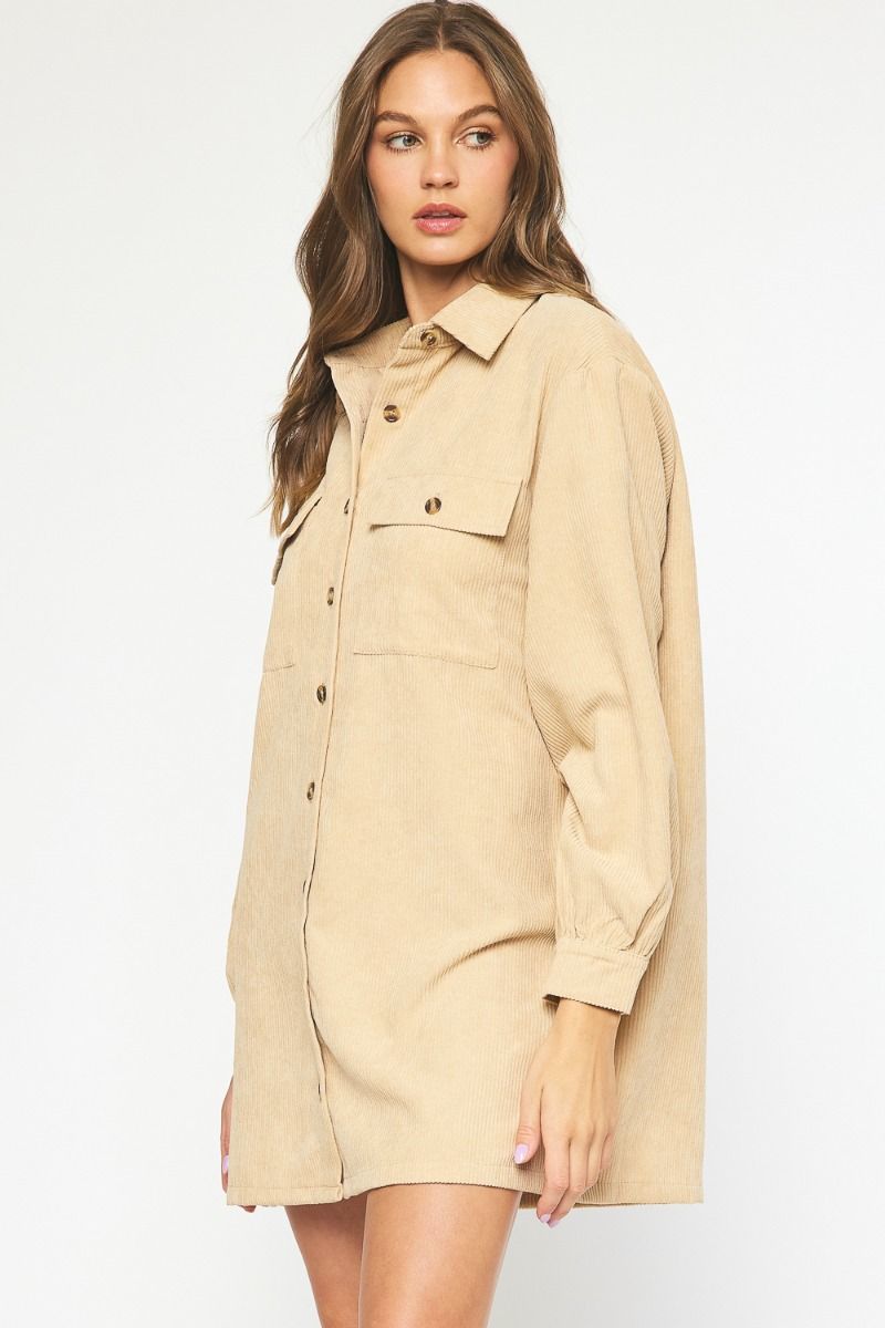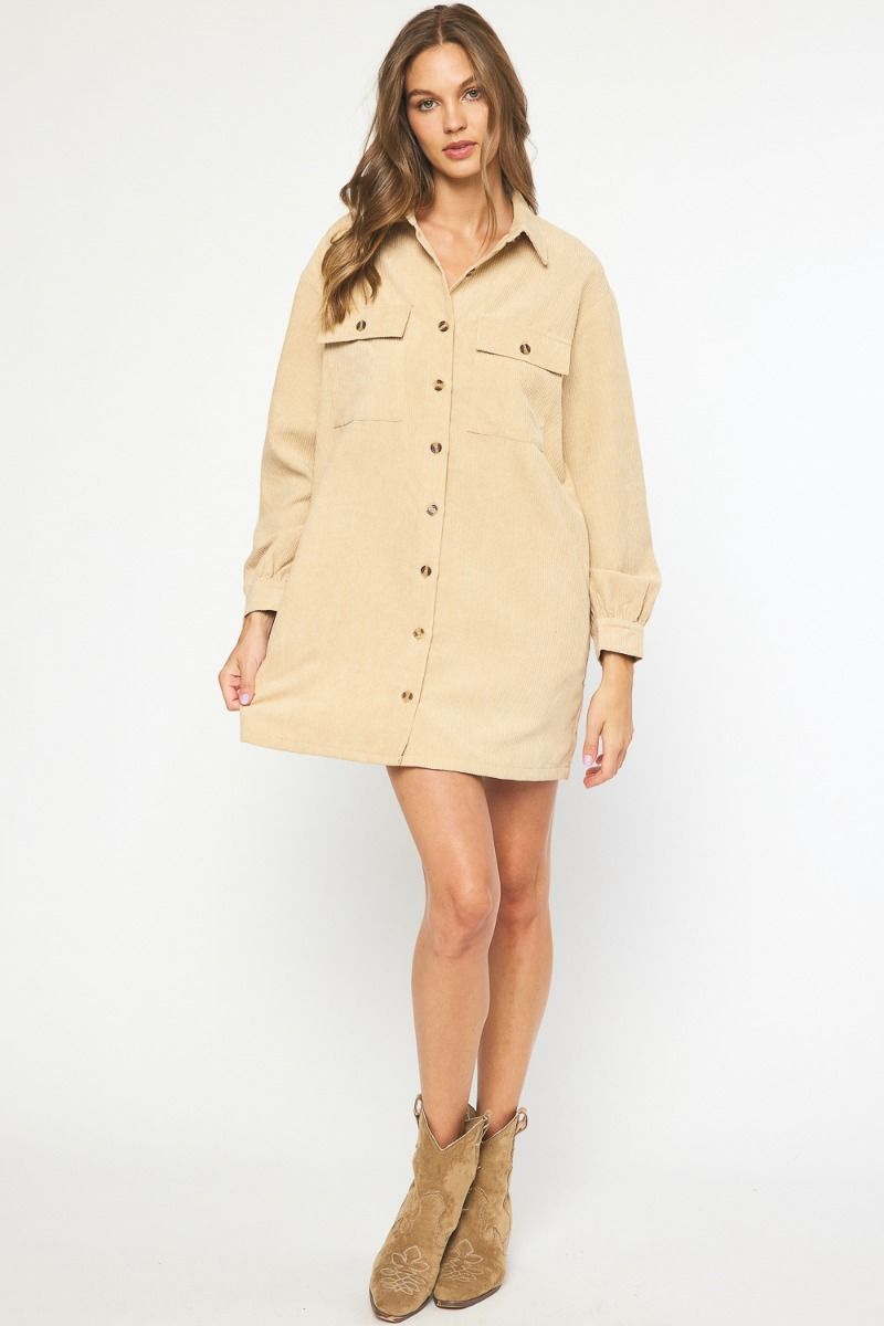 Corduroy collared button down long sleeve shirt dress featuring pockets at bust and sides. Unlined. Also available in mocha and cinnamon.