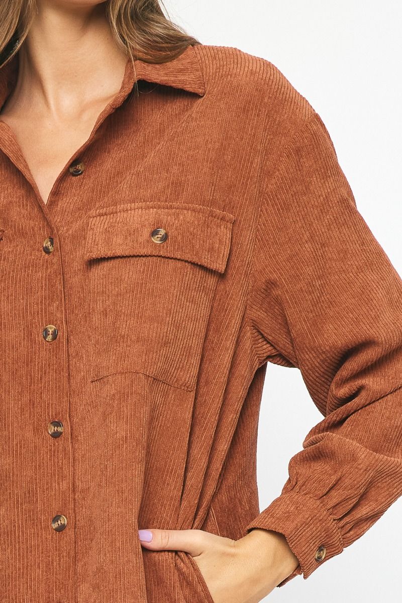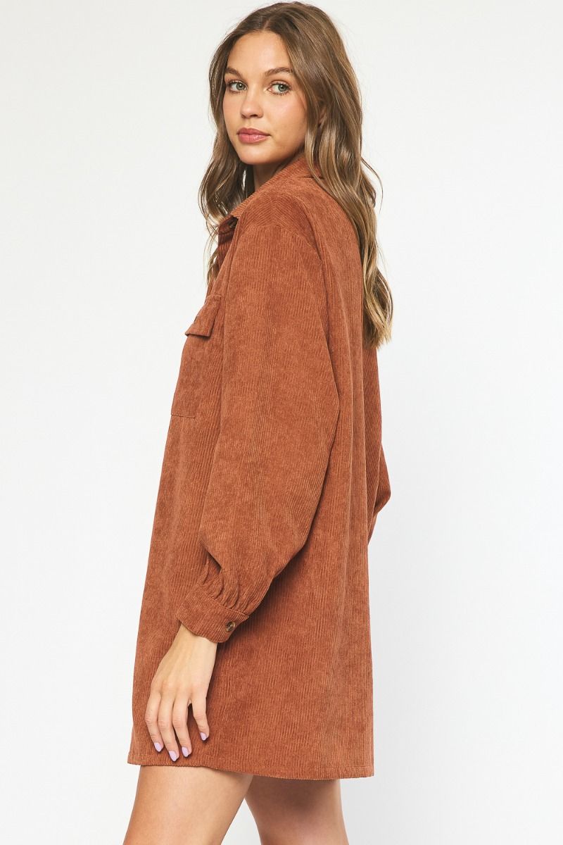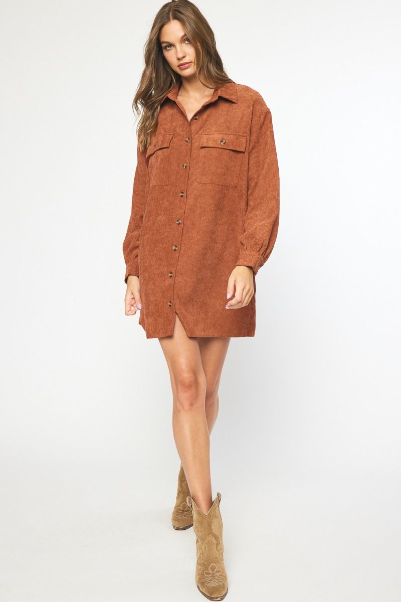 Corduroy collared button down long sleeve shirt dress featuring pockets at bust and sides. Unlined. Also available in bone and mocha.