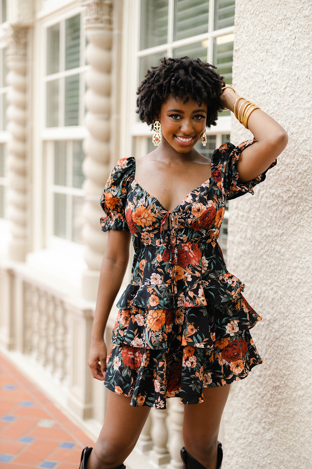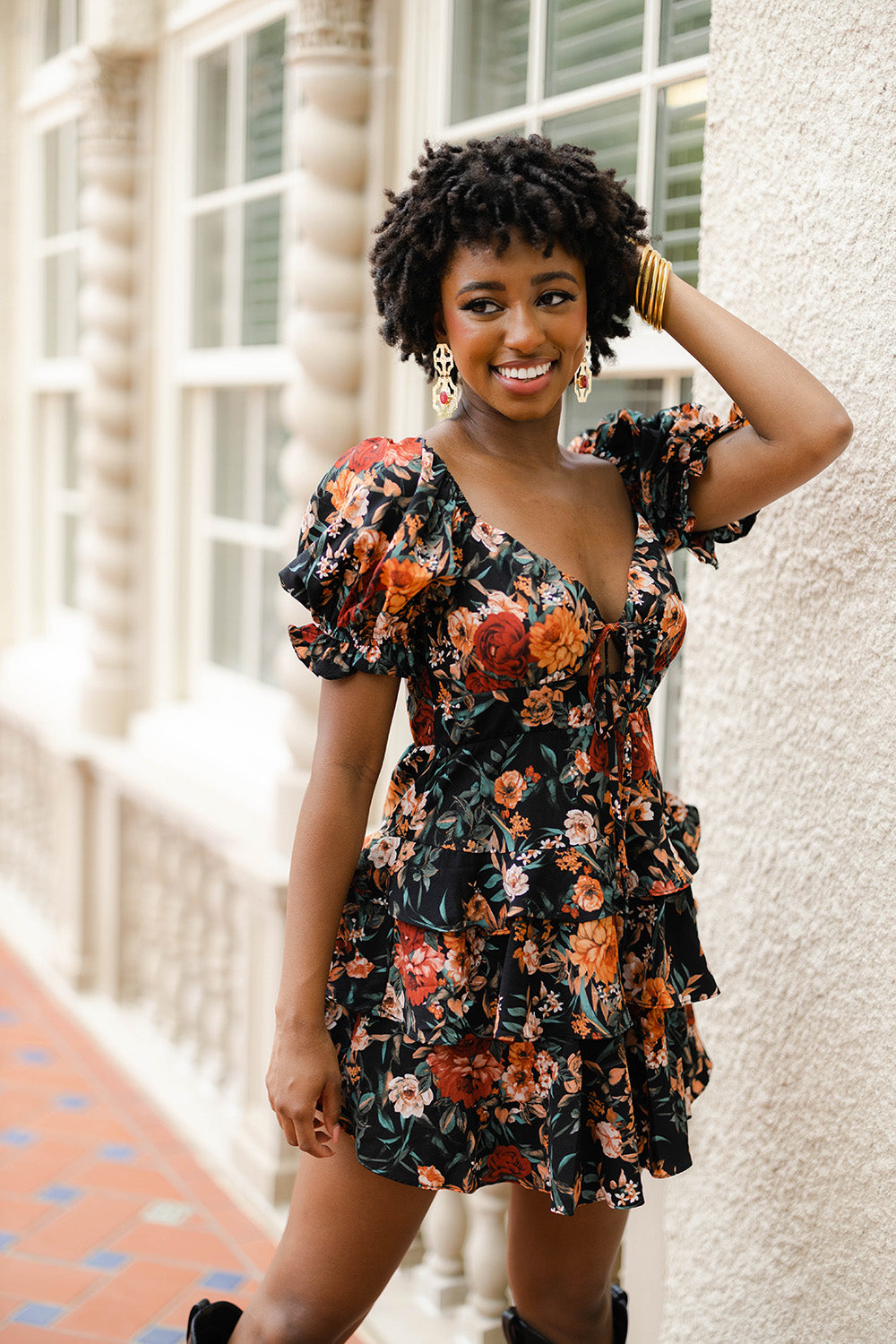 With a romantic puff sleeve and key hole front, this mini dress was made for your next event. The sweetheart neckline and ruffled hem give this dress a light and airy vibe. Pair with sneakers for your next tailgate or booties for brunch with the girls!