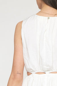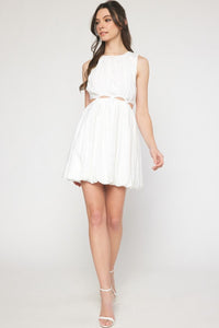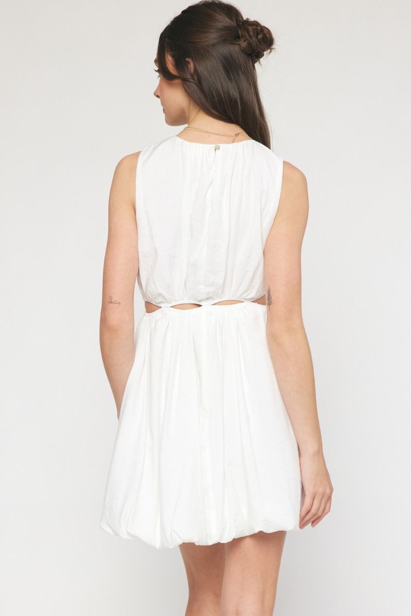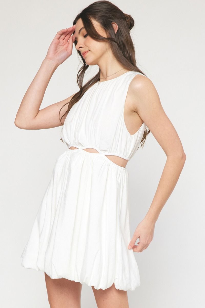 Lightweight round neck sleeveless bubble hem mini dress featuring cutouts around waist. Lined. Non-sheer.
