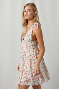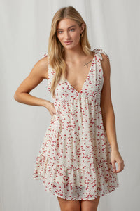 Deep V-neck heart print mini dress featuring self-tie shoulder straps and smocked back panel.