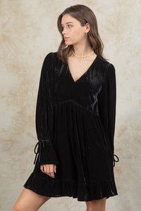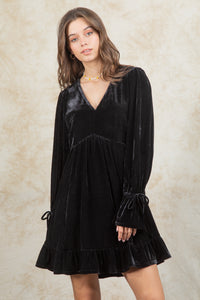 Velvet babydoll mini holiday dress featuring long bell sleeves with ties, V-neckline, and ruffle detailing.
