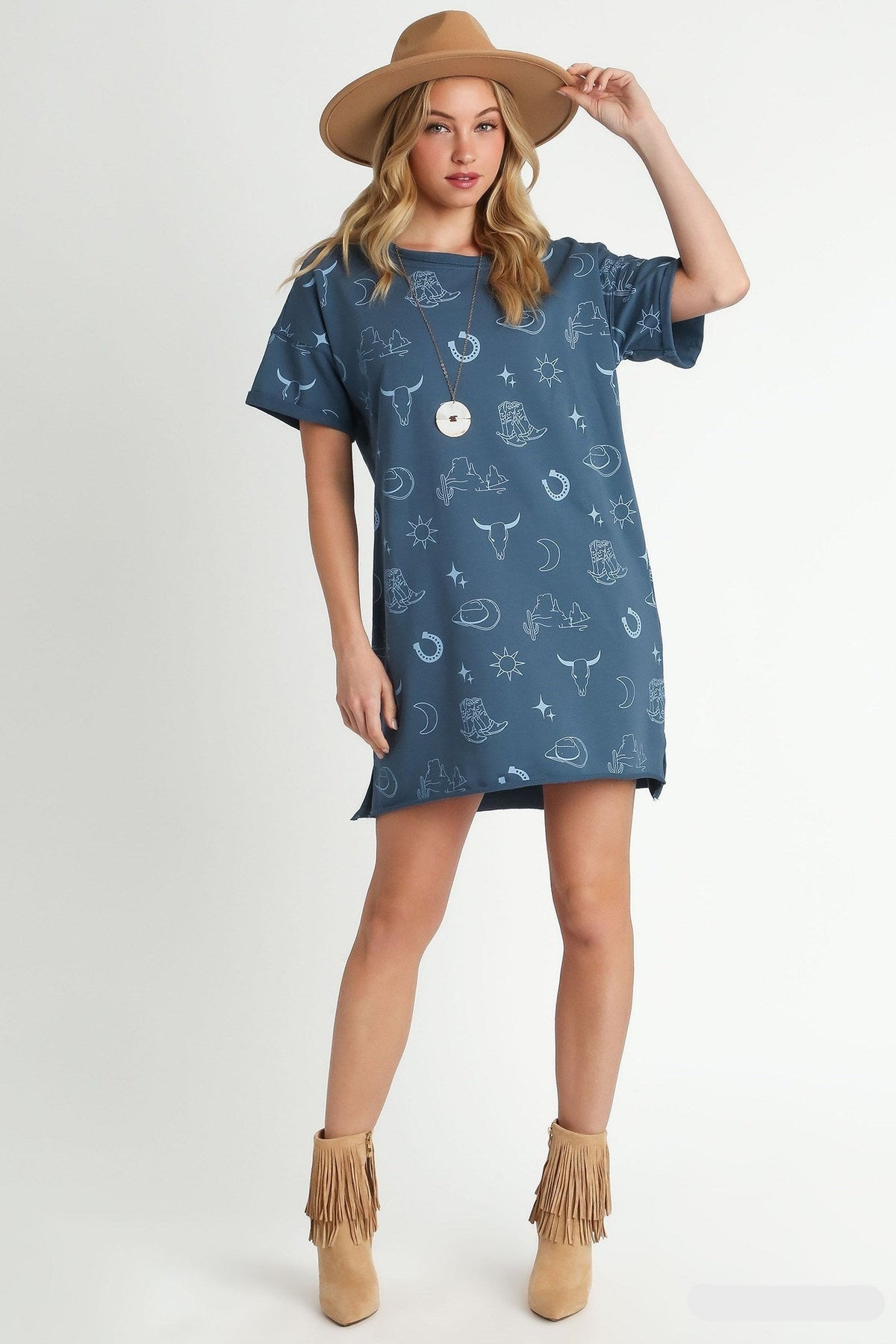 French terry round neck mini dress featuring all over graphic pattern, short sleeves, and exposed seams. Also available in natural.