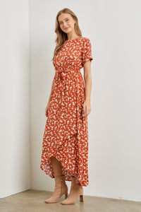 Floral print maxi dress featuring wrap skirt with asymmetrical hem, permanent rolled short sleeves, and self-tie belt at waist.