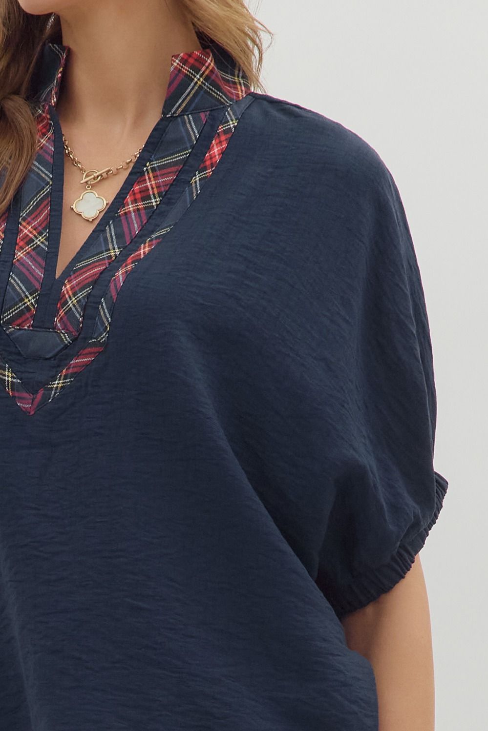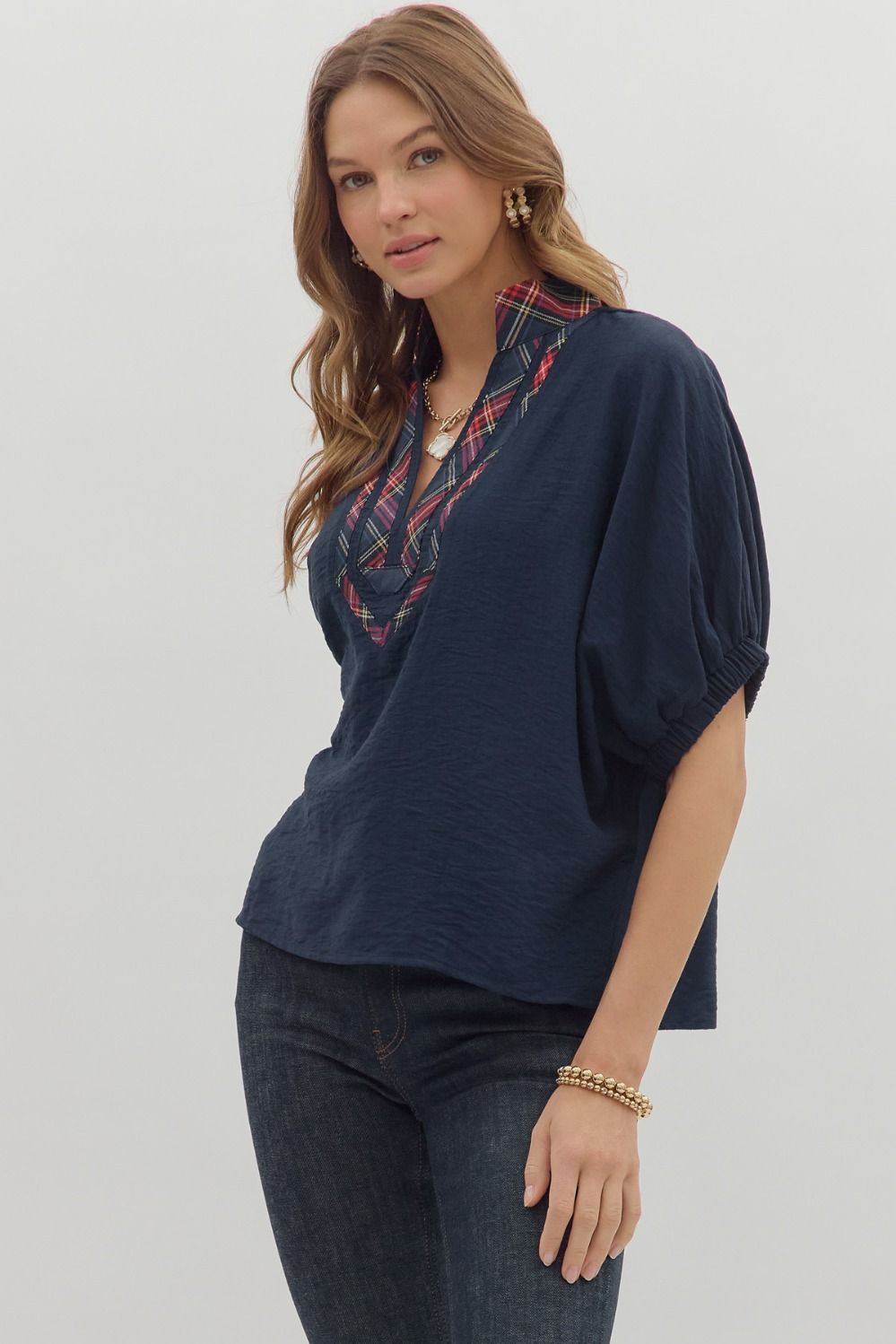 Solid dolman top featuring accented plaid contrast placket along caftan-inspired split neckline, and elasticated 1/2 sleeves. Unlined. Also available in taupe.