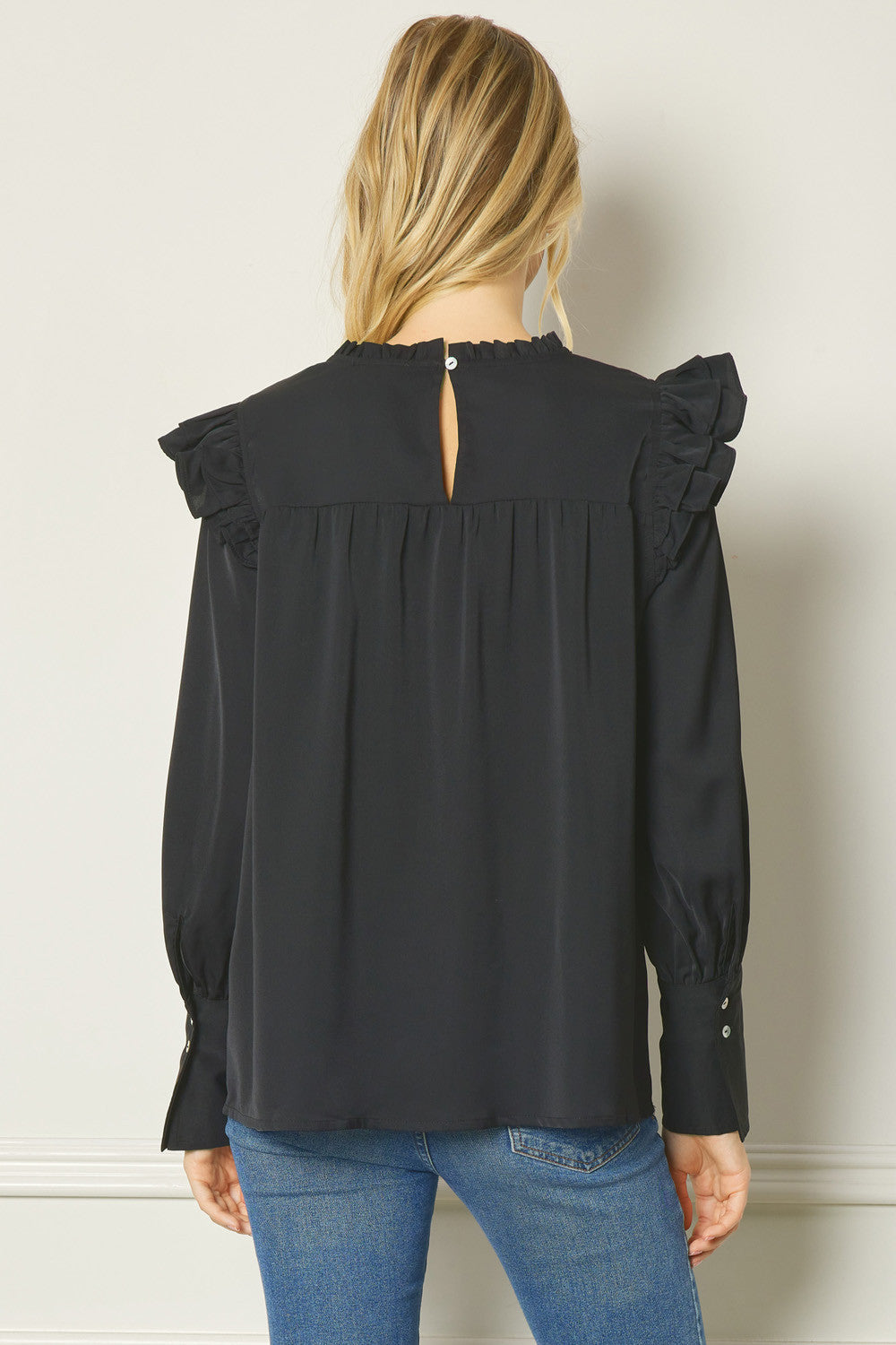 Long sleeve round neck top featuring pintuck detailing, keyhole button closure at back, and flutter detailing at sleeves. Unlined. Woven. Non-sheer. Lightweight.